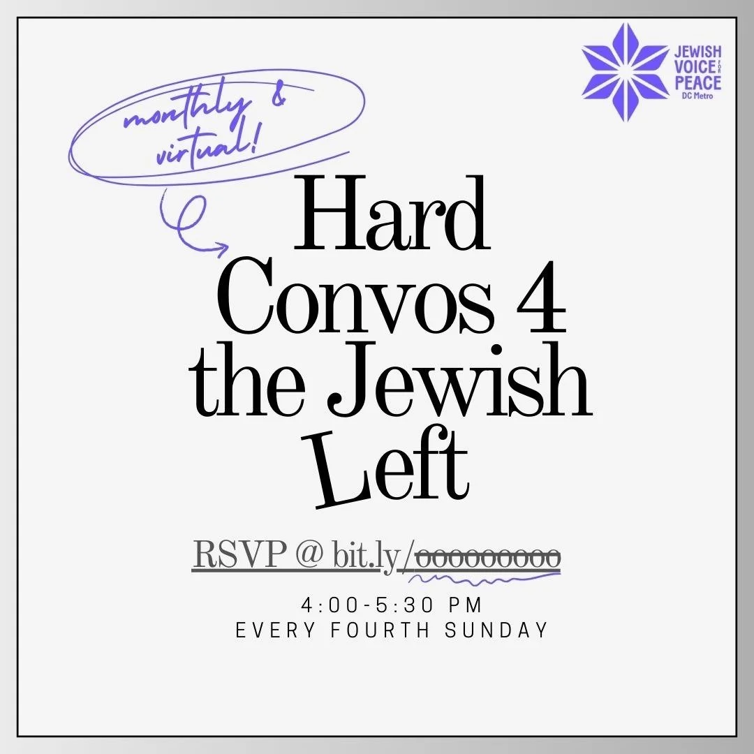Meeting every fourth Sunday from 4:00-5:30pm, this community discussion group provides an opportunity for members of JVP and aligned groups to engage with tough questions and issues affecting the movement for a free Palestine and the progressive Jewish Left together in a safe, virtual environment.